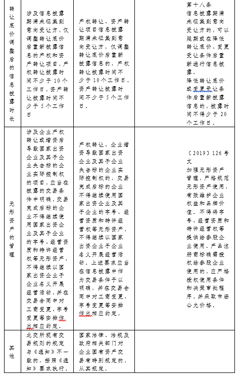 八、產權轉讓、資產轉讓項目信息披露期滿未征集到意向受讓方,僅調整轉讓底價后重新披露信息的,產權轉讓披露時間不少于10個工作日,資產轉讓披露時間不少于5個工作日。(與32號文相應規(guī)定相比,縮短了信息披露的時間,提升了效率)