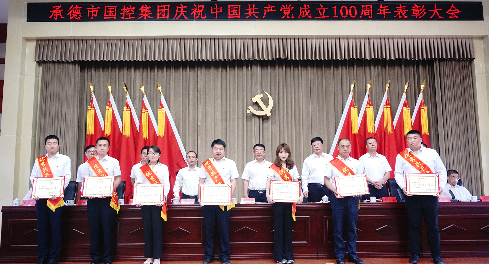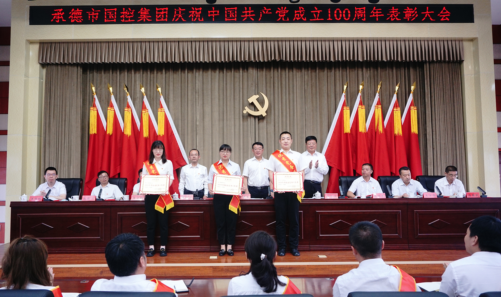 表彰大會(huì)氣氛隆重?zé)崃?,大?huì)在全場(chǎng)起立高唱國(guó)歌聲中開(kāi)幕。集團(tuán)公司黨委決定,授予許平凡等7名共產(chǎn)黨員“優(yōu)秀共產(chǎn)黨員”稱號(hào),授予胡斌偉等3名黨務(wù)工作者“優(yōu)秀黨務(wù)工作者”稱號(hào)。現(xiàn)場(chǎng)向先進(jìn)個(gè)人頒發(fā)了證書(shū),并向參加“慶祝中國(guó)共產(chǎn)黨成立100周年書(shū)畫(huà)攝影大賽”獲獎(jiǎng)的人員頒發(fā)了榮譽(yù)證書(shū)。